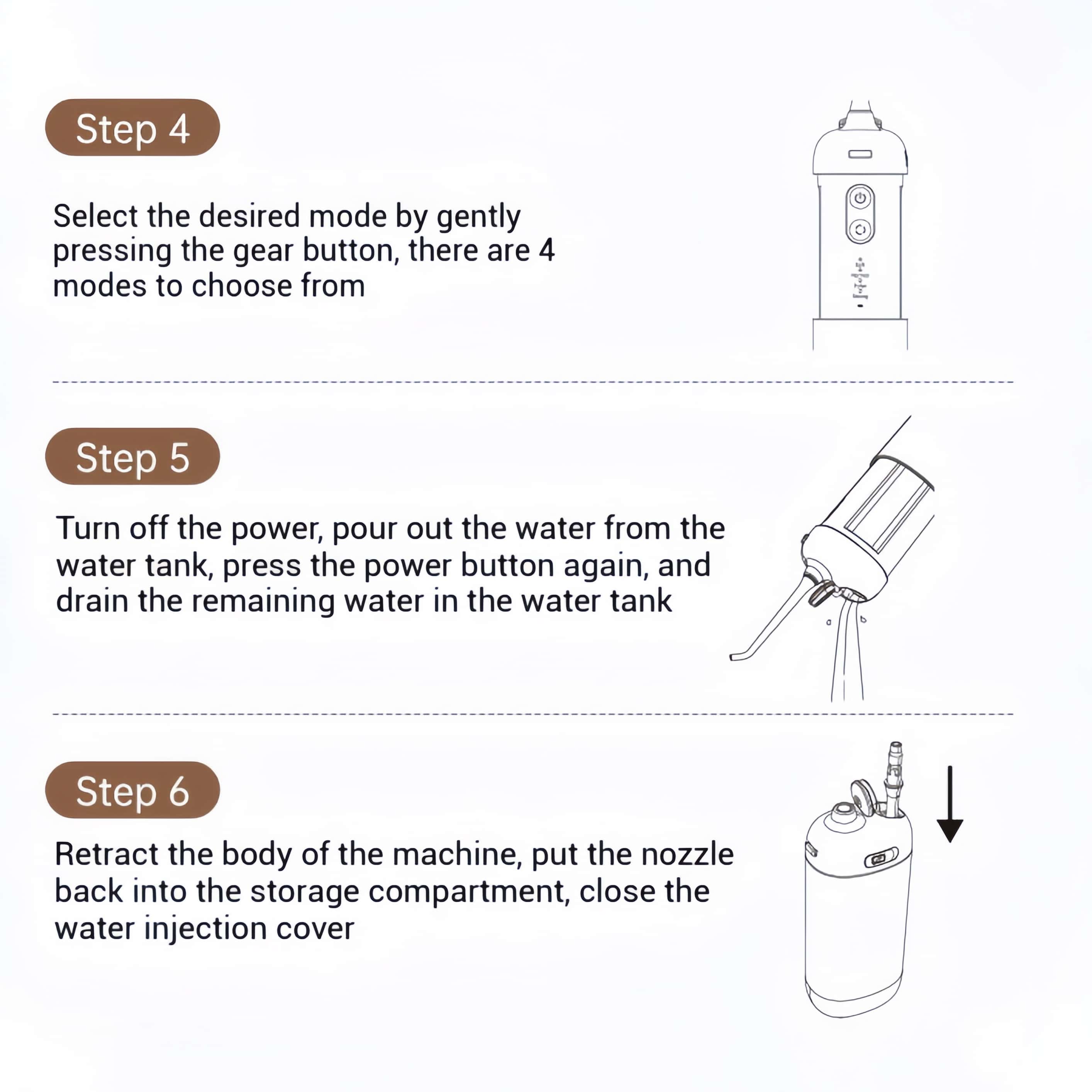 • After Use: Always drain any remaining water from the tank and the unit's internal tubing by turning the device on after emptying the tank, letting it run until no more water comes out.