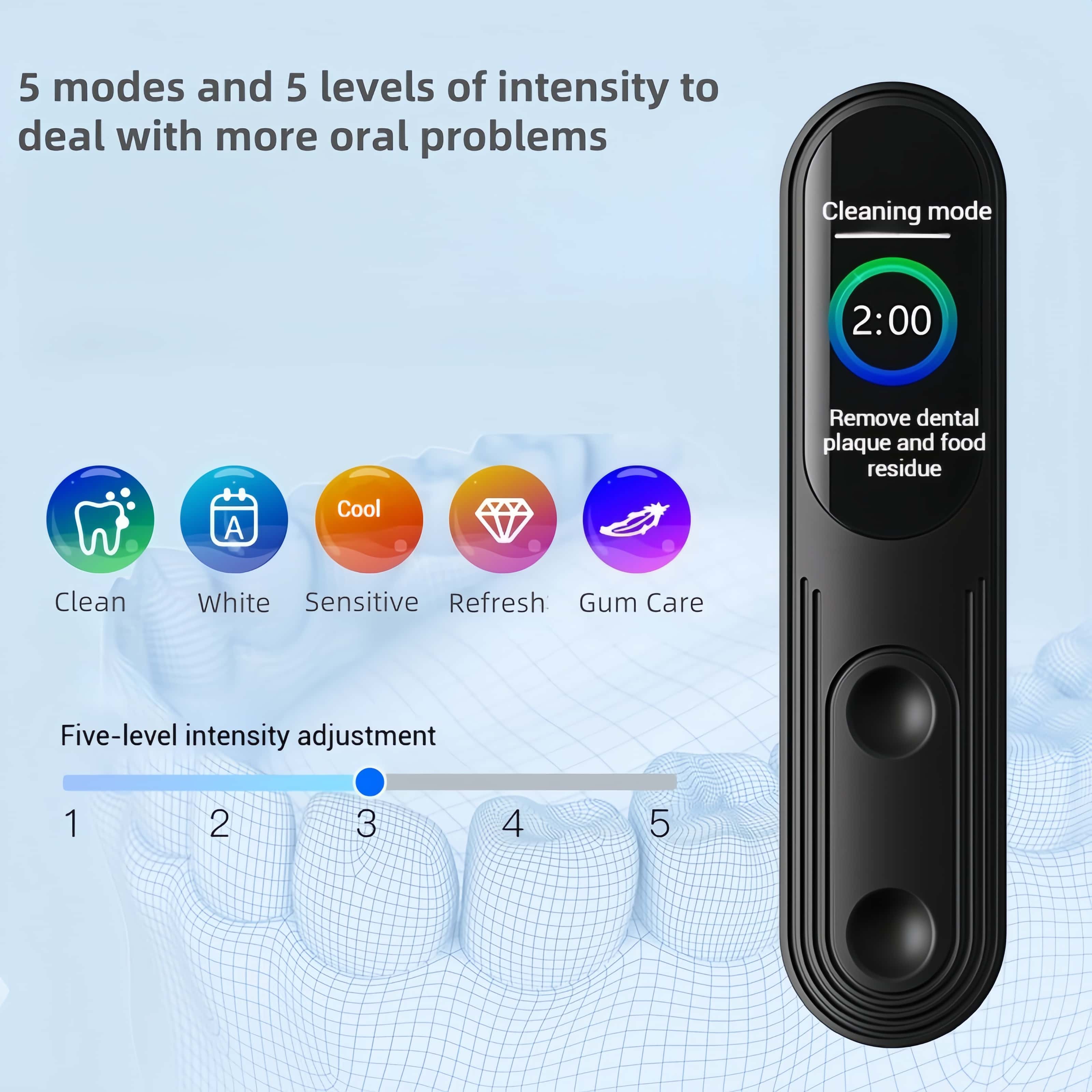 - 5 Brushing Modes and 5 Levels of Intensity to Deal with More Oral Problems